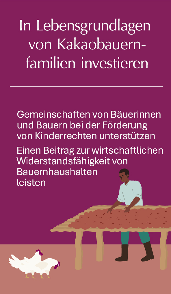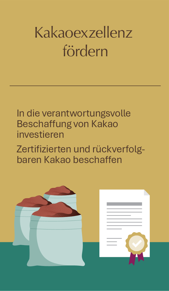 Seit Nachdem wir unser Ziel, 100% der Kakaobohnen über das Farming Program zu beziehen, im Jahr 2020 erreicht hatten, erweiterten wir das Programm 2021 auf Kakaobutter und 2022 auf Kakaopulver. Seit 2026 ist unser gesamter Kakao von der Rainforest Alliance zertifiziert. Die Rainforest-Alliance-Zertifizierung bildet die Grundlage für unsere gesamte Kakaobeschaffung. Darauf aufbauend tätigen wir gezielte Investitionen und setzen ergänzende Massnahmen zur Lösung wesentlicher Herausforderungen im Kakaosektor um, wie etwa die Bekämpfung von Kinderarbeit, ein existenzsicherndes Einkommen, Emissionssenkungen und Waldschutz.
