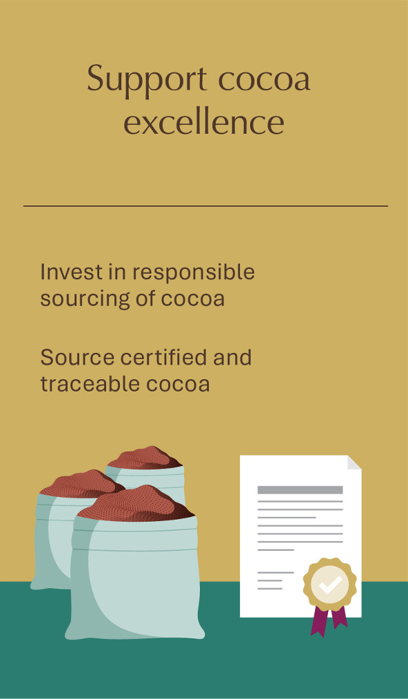 After achieving our goal to source 100% of our cocoa beans through the Farming Program in 2020, we extended the program to include cocoa butter in 2021 and cocoa powder in 2022. As of 2026, we require our sourced cocoa to meet the requirements of the Rainforest Alliance certification. Rainforest Alliance certification forms the basis for all cocoa sourced. Building on the foundation of the Rainforest Alliance certification, targeted investments and complementary actions are implemented to address key issues in the cocoa sector such as child labor, living income, emissions and forest conservation.